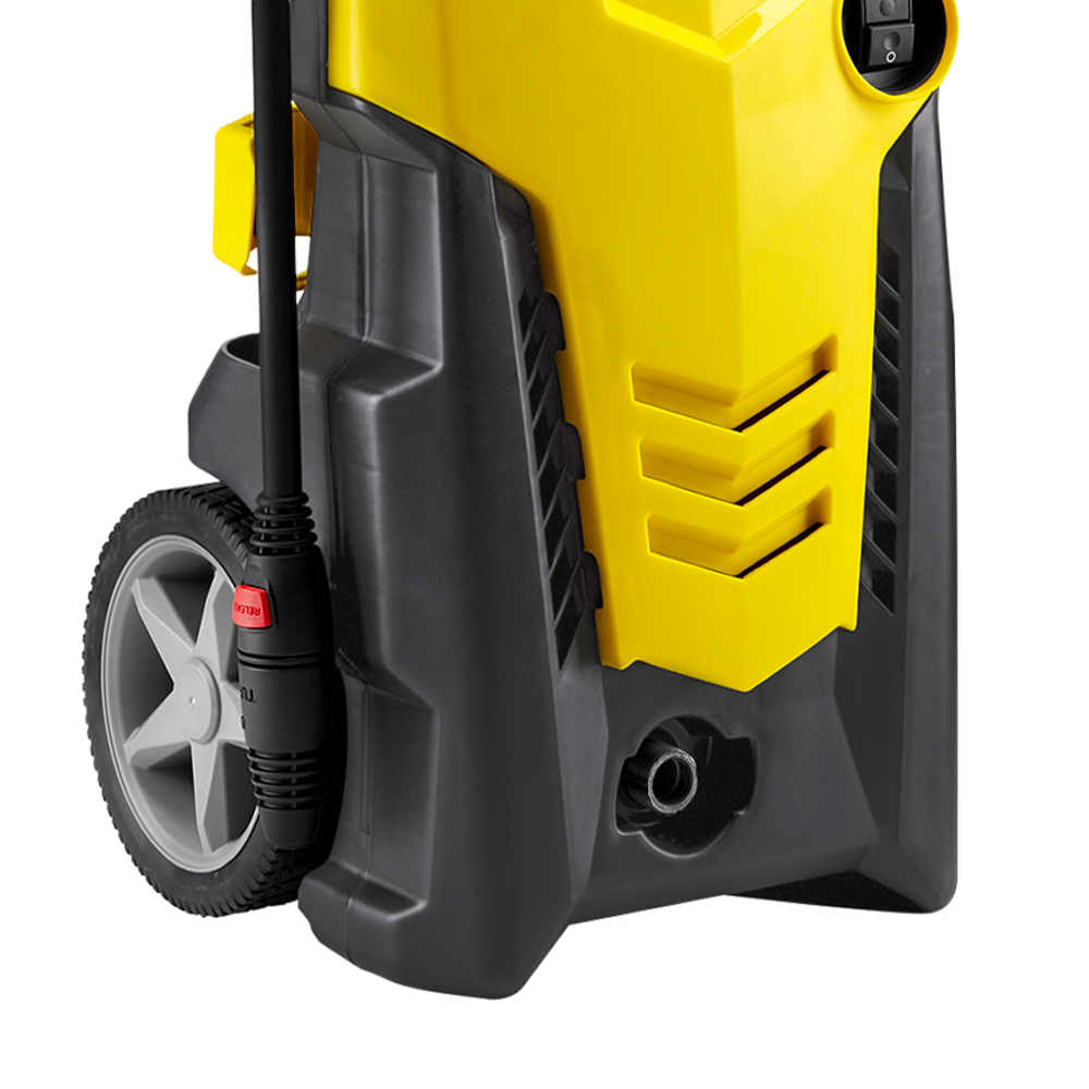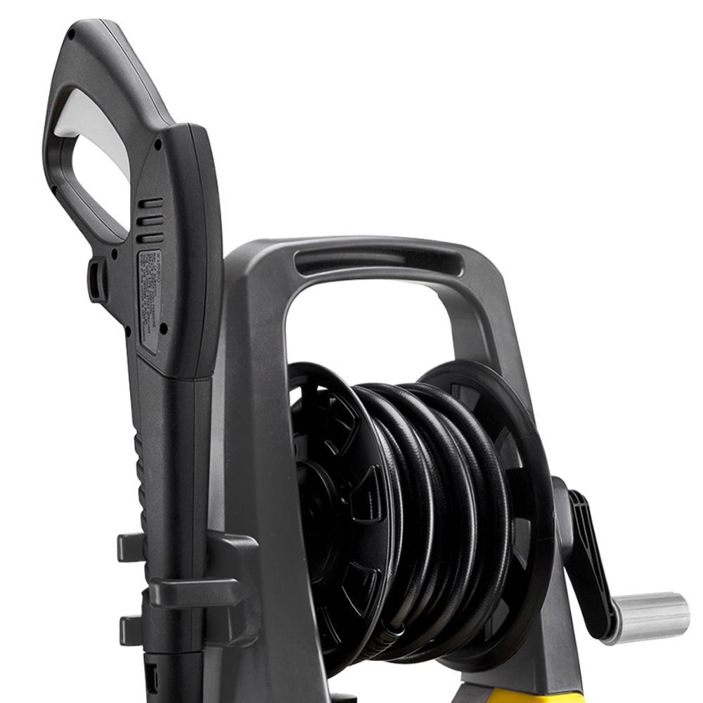 Equipada con un práctico carro y enrollador de manguera para facilitar los desplazamientos y garantizar estabilidad durante el uso. Ideal para lavar el coche, la moto, terrazas, paredes y pavimentos exteriores en general.